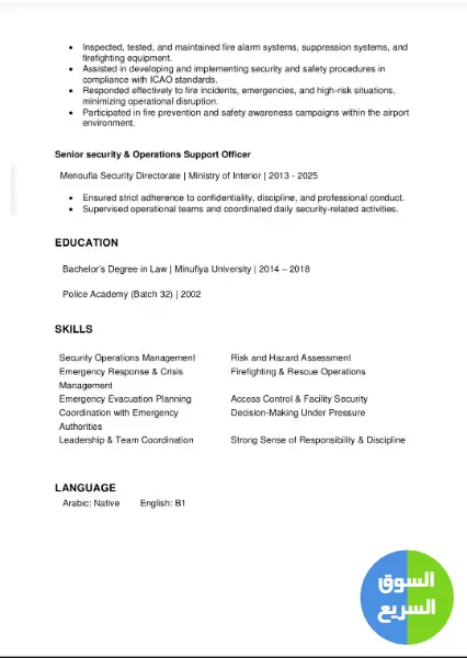 Tariq Daoud has 23 years of experience with the Egyptian Ministry of Interior, including 10 years in the field of safety at Cairo International Airport, and holds 7 certificates in the field.